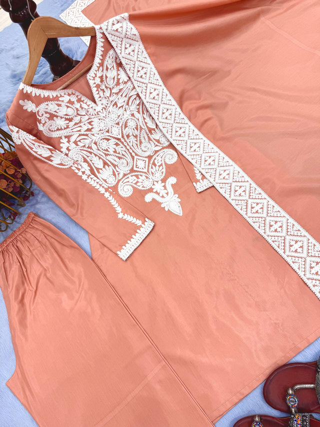 *Palazzo Fabric*:Pure Dull Satin Silk With Embroidery Work With Elastic