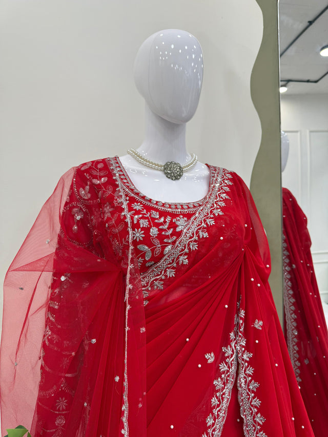 Sequence With Pearl Work Red Color Embellished Net Saree