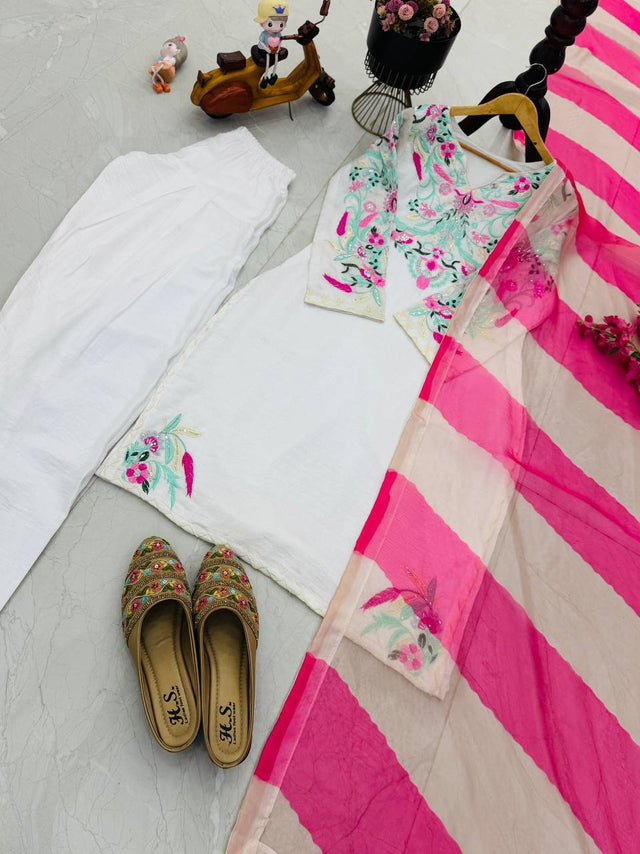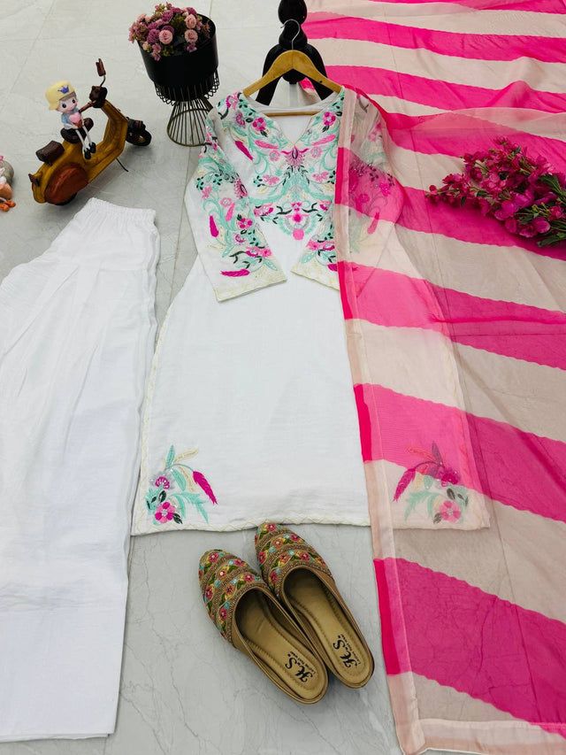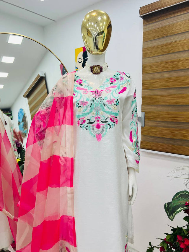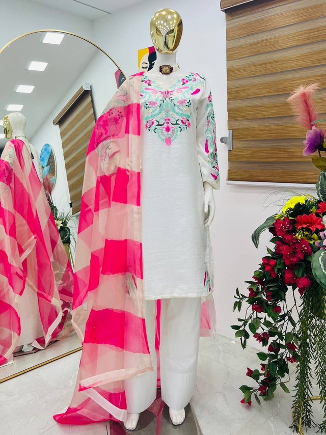 Sequence Work Vichitra Silk White Color Palazzo Suit