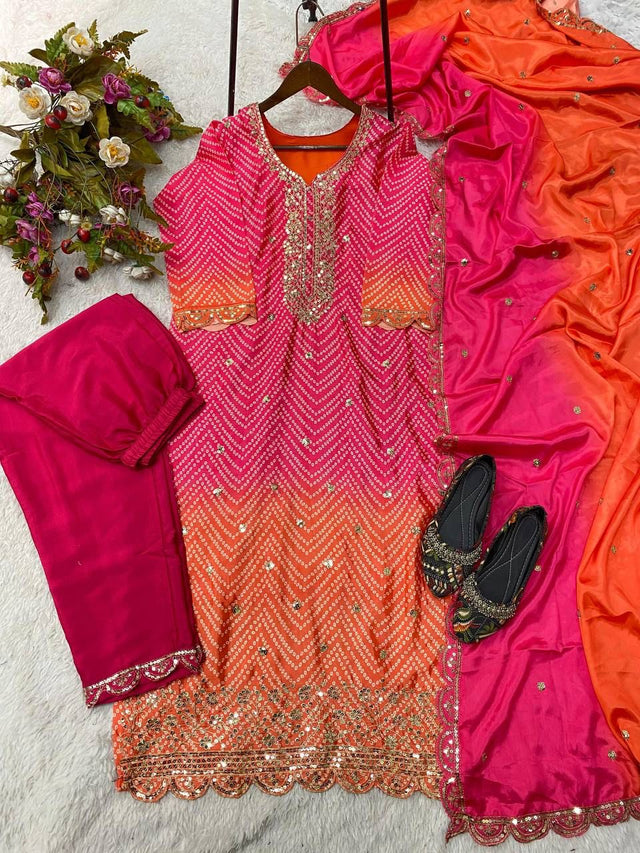 Pure Chinno Silk With Digital Print Sequence Embroidery Work On Dupatta (2.2 Mtr)