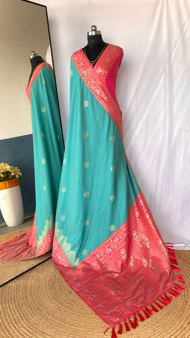 🥻👉🏻Description - Dual tone silk sarees with all over zari weaves, Contrast pallu and designer chaap border.
