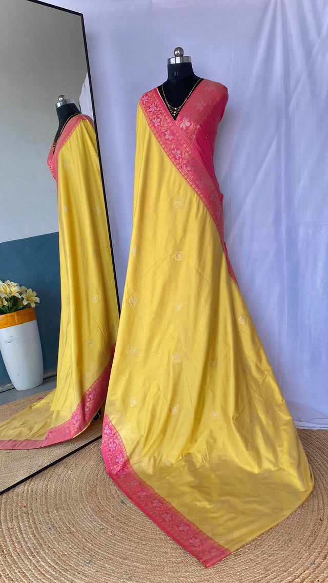 🥻👉🏻Description - Dual tone silk sarees with all over zari weaves, Contrast pallu and designer chaap border.