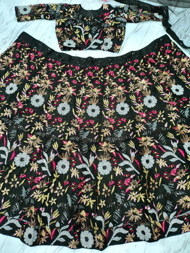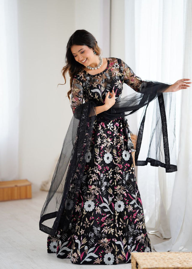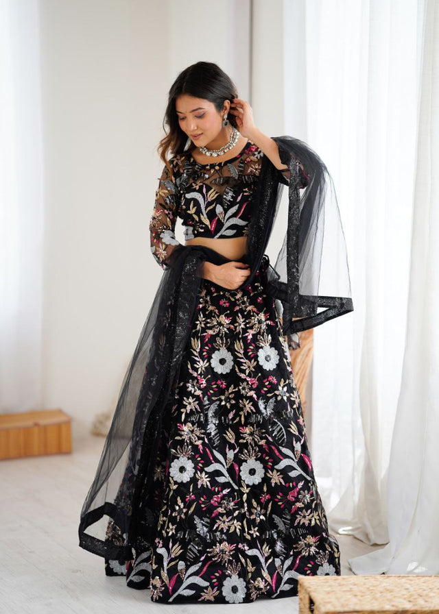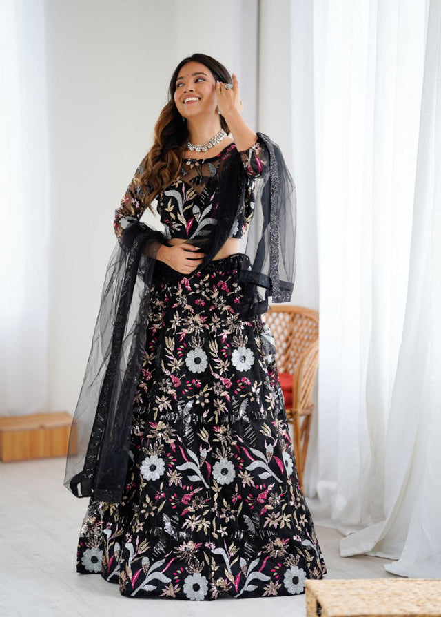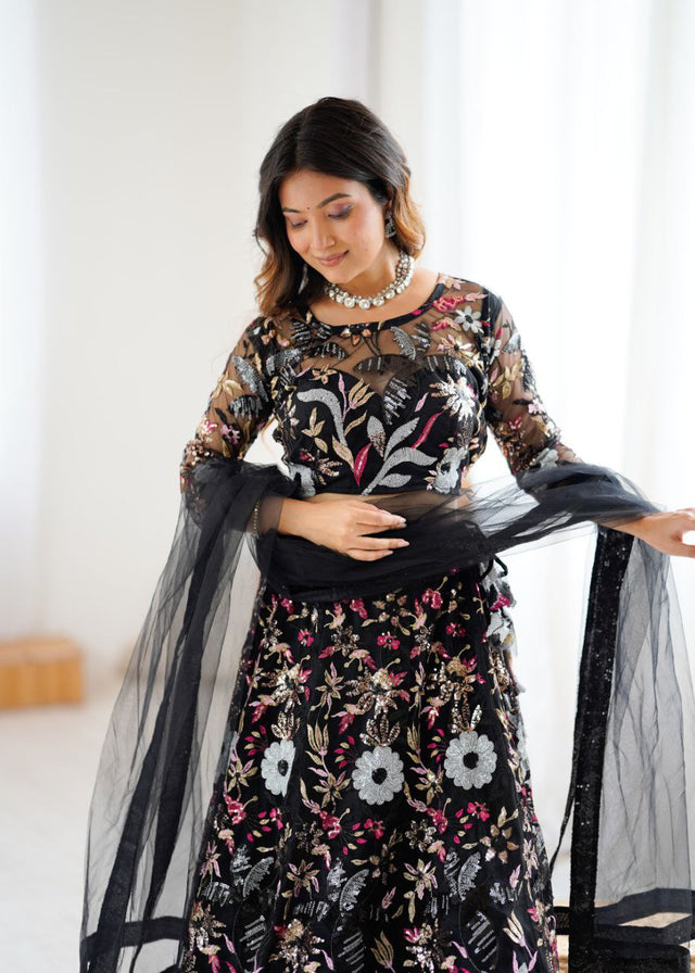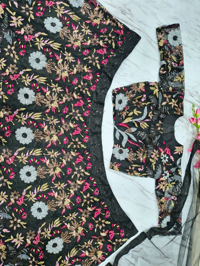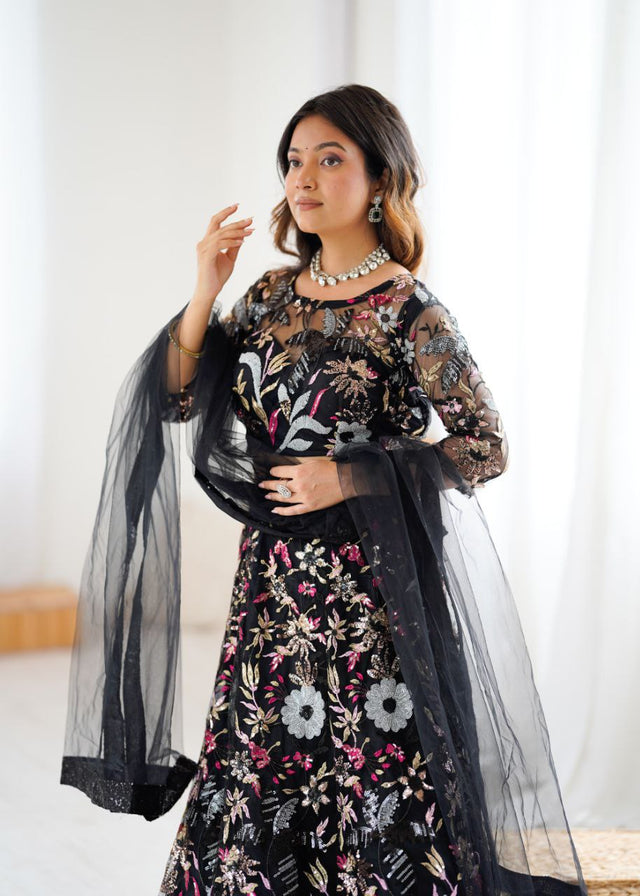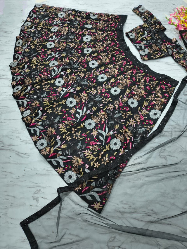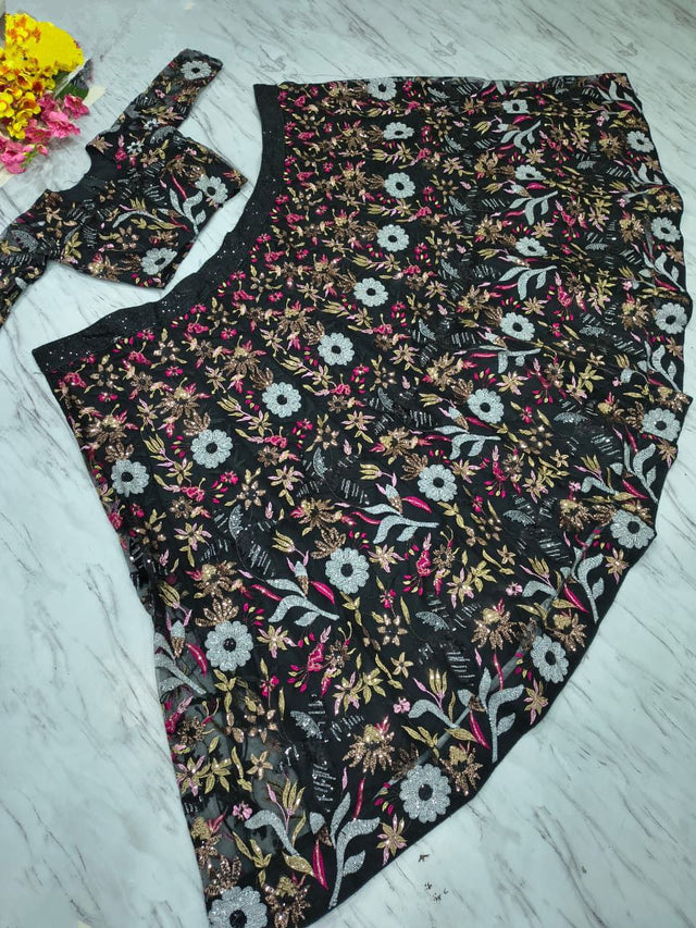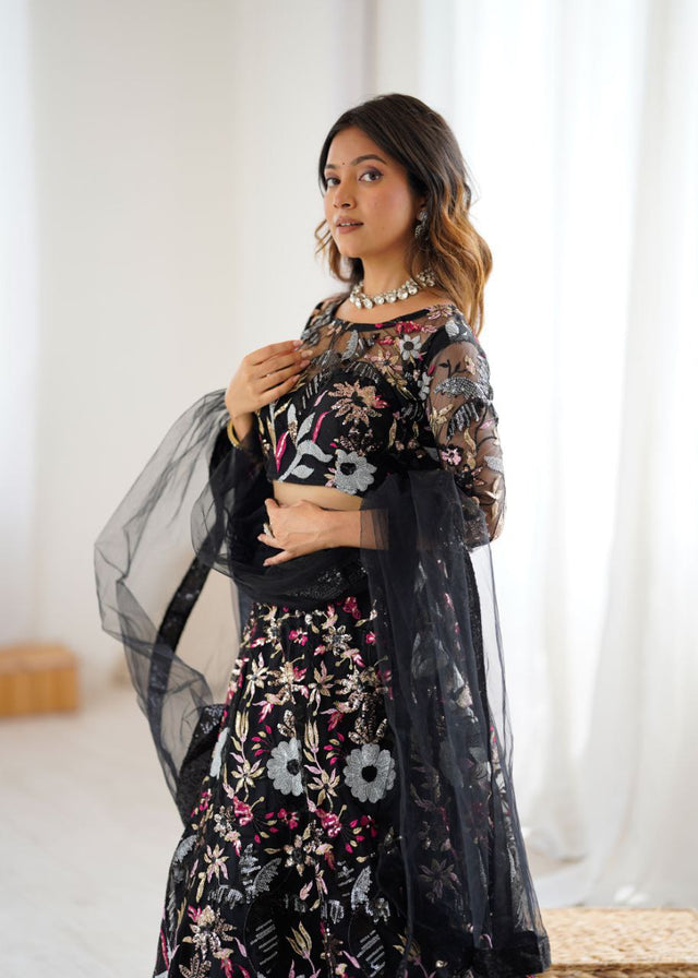 Stylish Black Color Net Embroidery Work Lehenga Choli