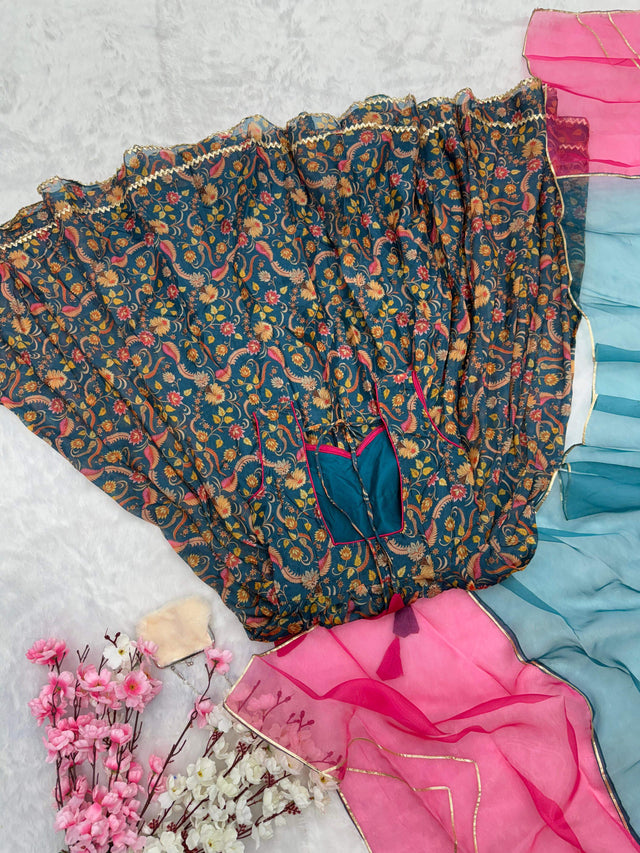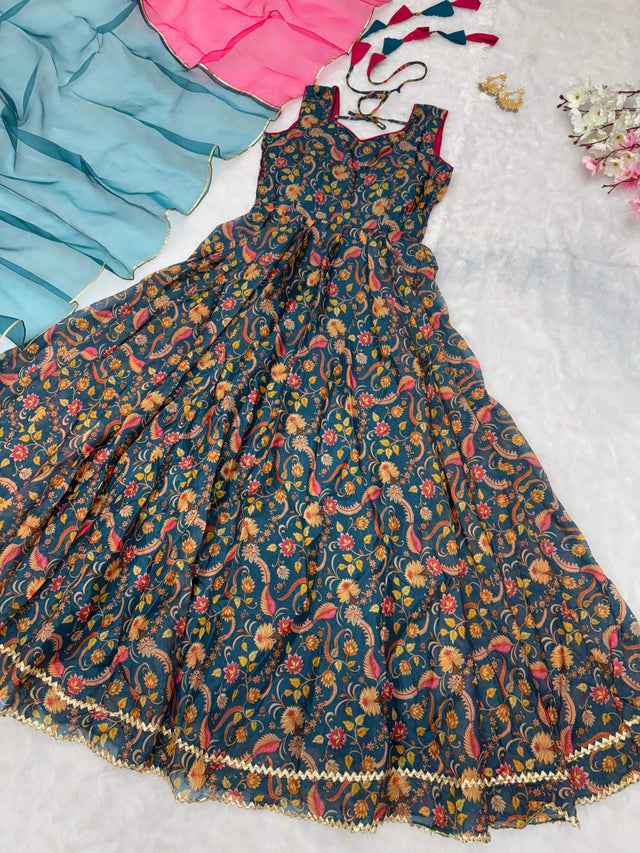 Stylish Teal Blue Color Organza Digital Printed Gown