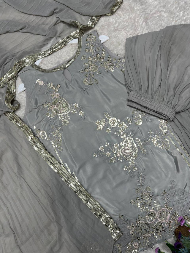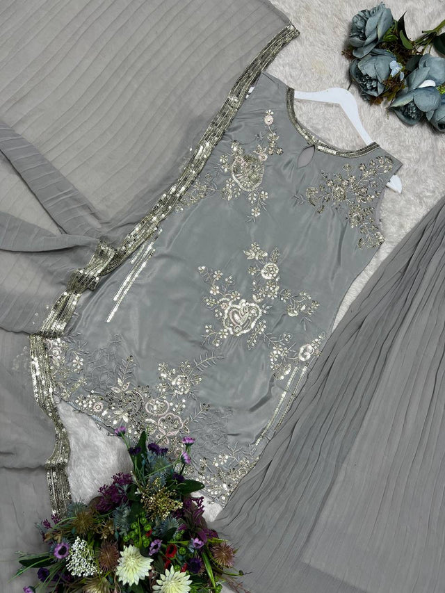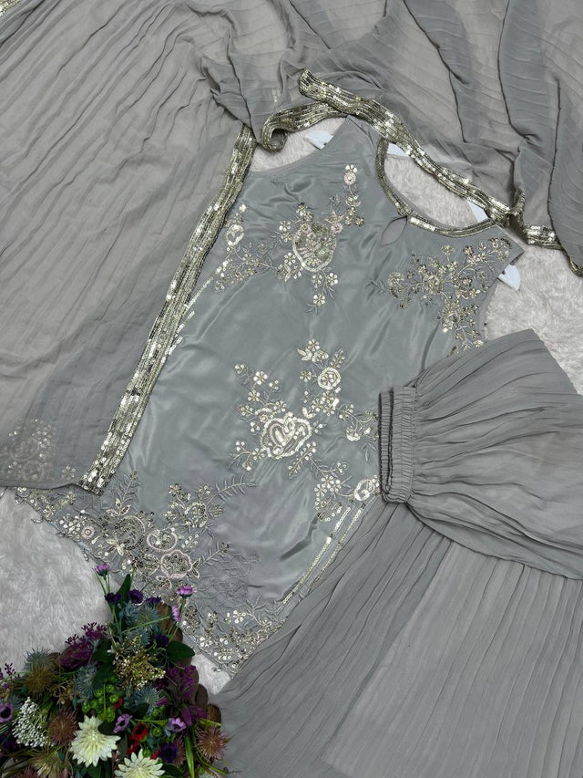 Stylish Gray Color Embroidery Work Palazzo Suit