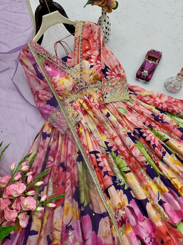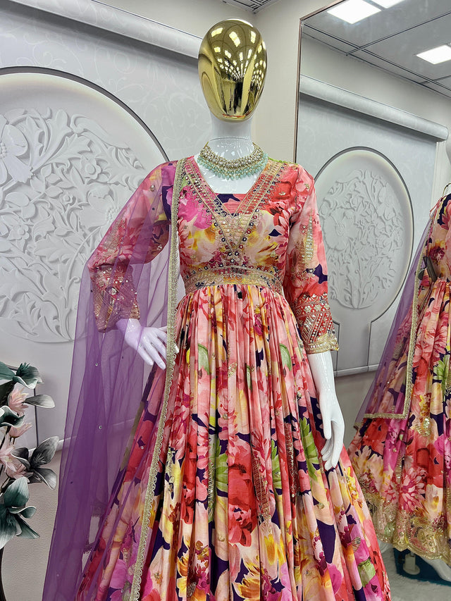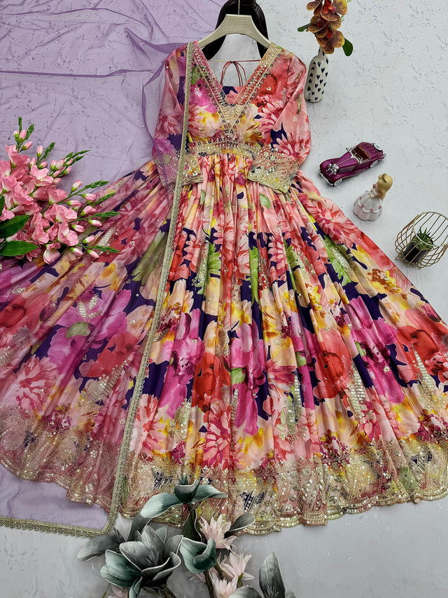 Stylish Multi Color Chinon Silk Embroidery Work Gown
