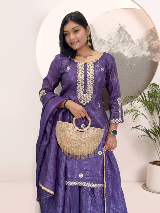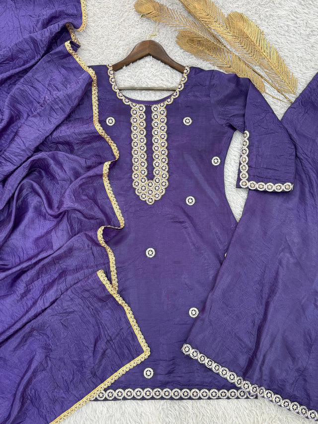 Stylish Purple Embroidery Work Silk Palazzo Suit