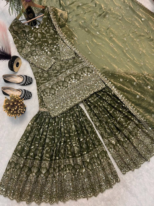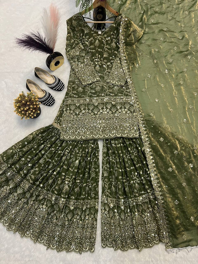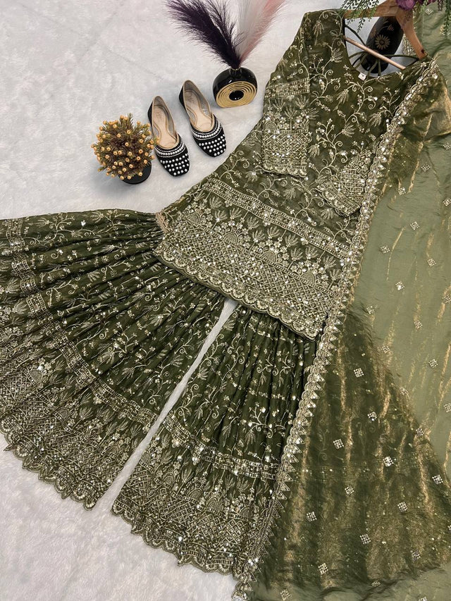 Stylish Green Color Sequence Work Silk Sharara Suit