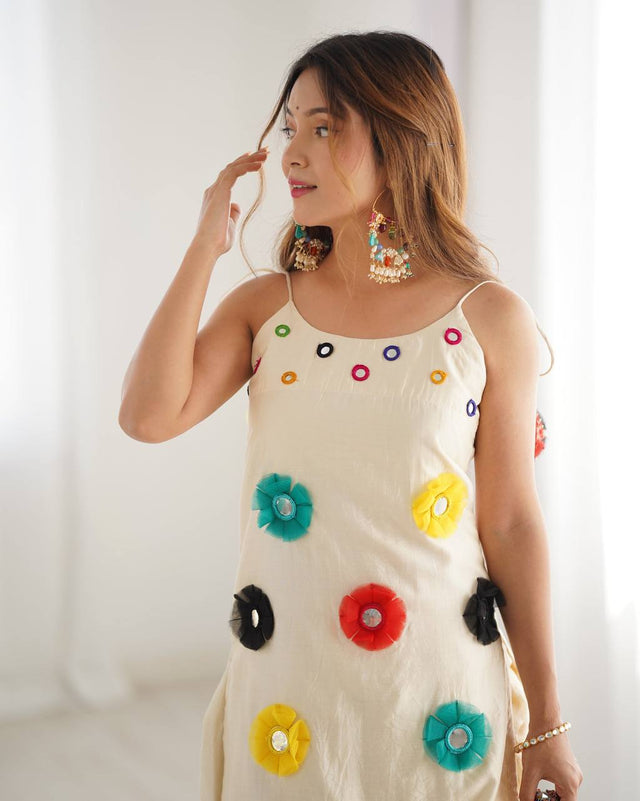 Stylish White Cotton With Mirror Work Dhoti Suit