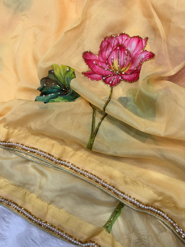 Exuding grace and sophistication, this floral-printed organza saree blends classic beauty with modern elegance. Each delicate petal in the design tells a story of timeless charm, making it the perfect choice for those who appreciate both tradition and contemporary style.