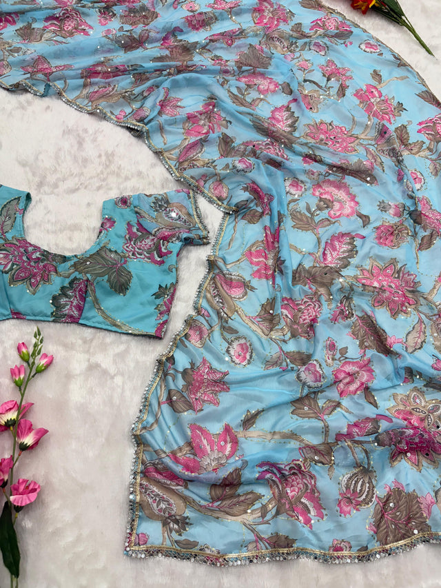 Tabby Silk Sky Blue Color Printed Party Wear Saree