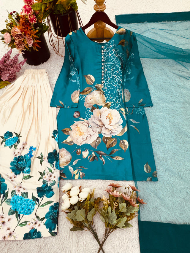 Teal Green Color Flower Print Beautiful Palazzo Suit