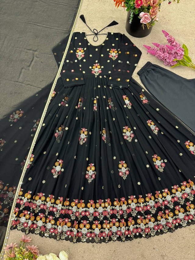 Thread Embroidery Work Flattering Black Color Gown