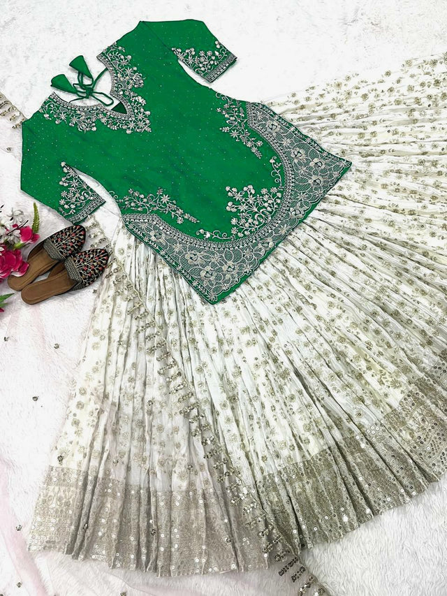 Traditional Wear Embroidery Work Green Color Top With Lehenga