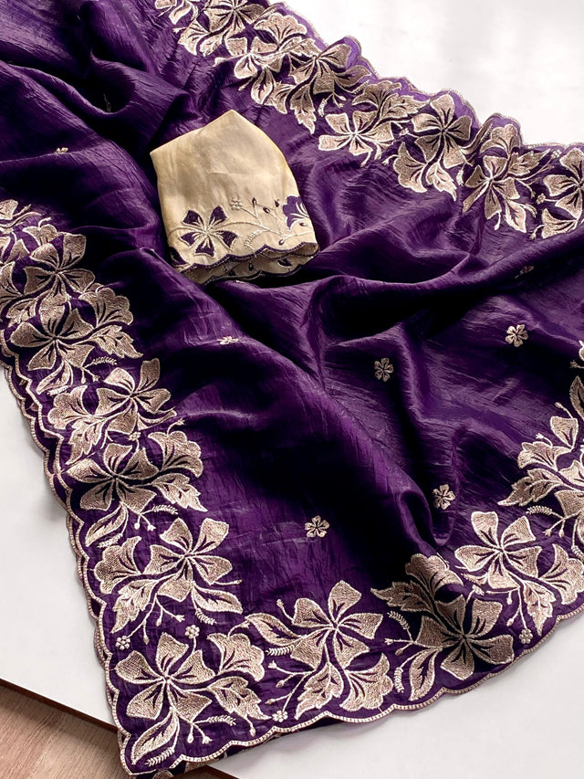 🥻👉🏻 Premium crush silk sarees with intricate flower embroidery pattern and cutwork border all over.