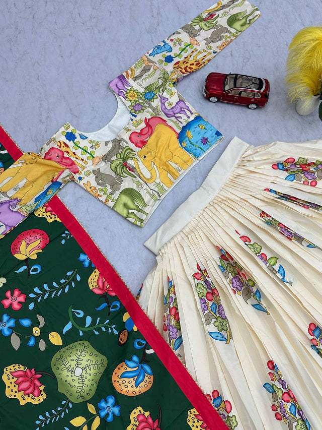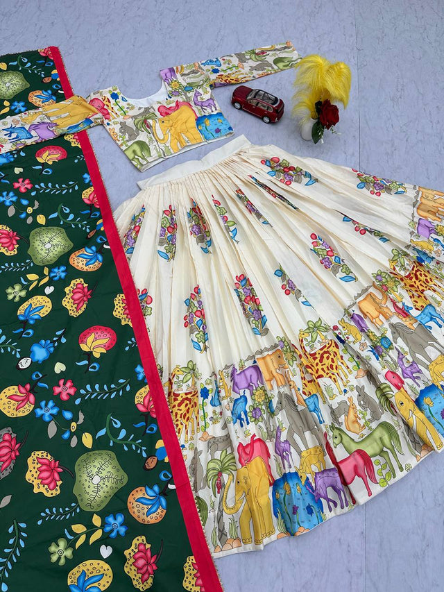 Traditional Wear Kalamkari Print Cream Color Lehenga Choli