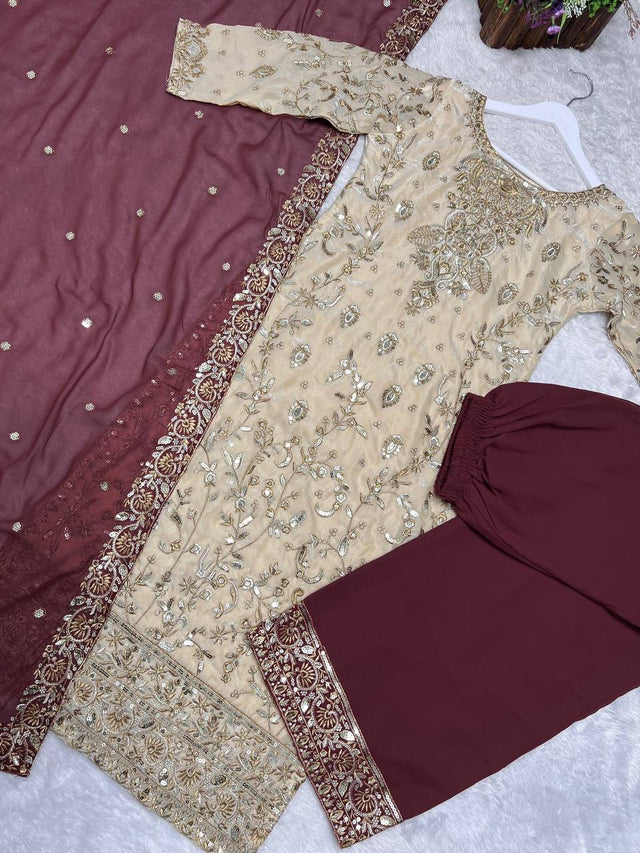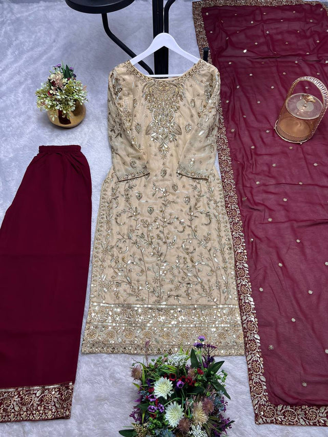 Trendy Beige Embroidery Work Straight Salwar Suit
