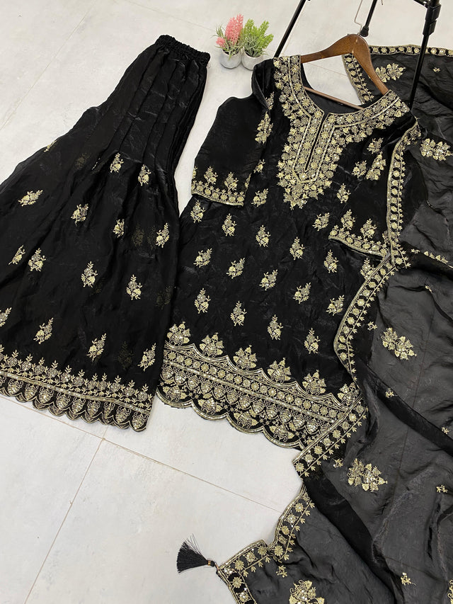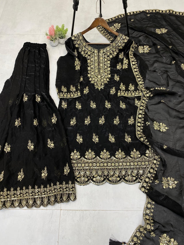 Trendy Black Fendy Embroidery Work Sharara Suit