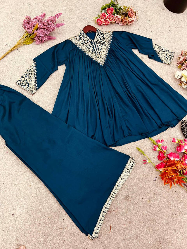 Trendy Royal Blue Chinon Embroidery Palazzo Suit