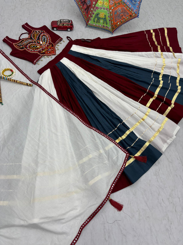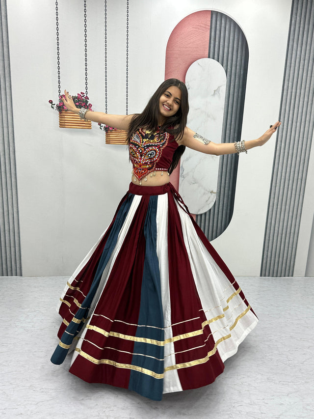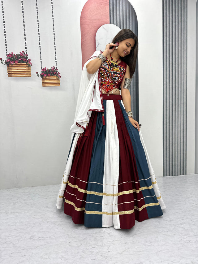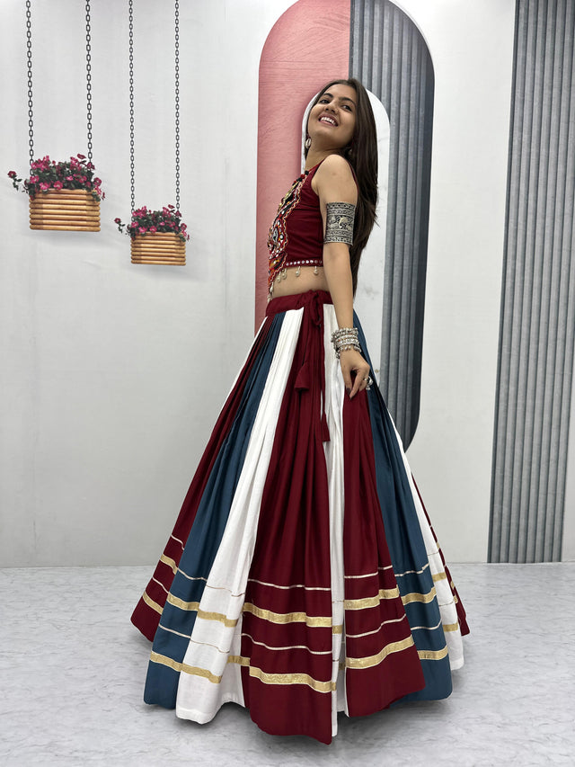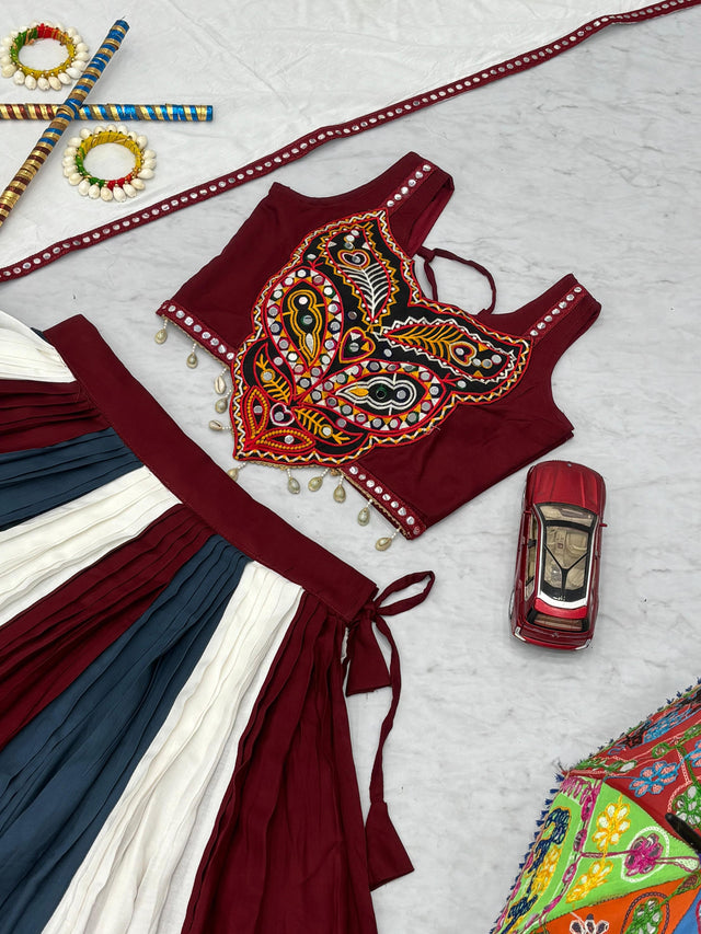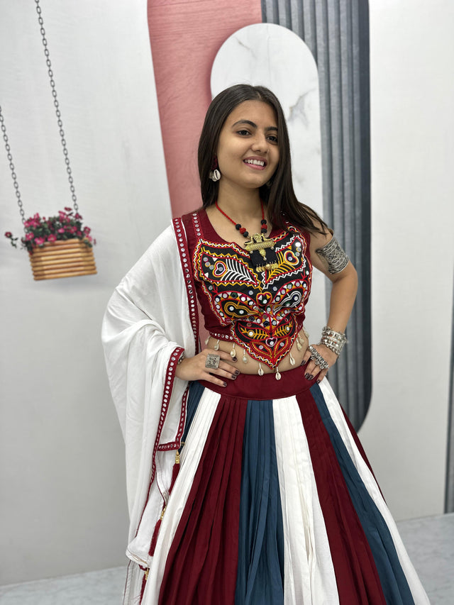 Trendy Multicolor Rayon Cotton Gamthi Work Lehenga Choli For Navratri