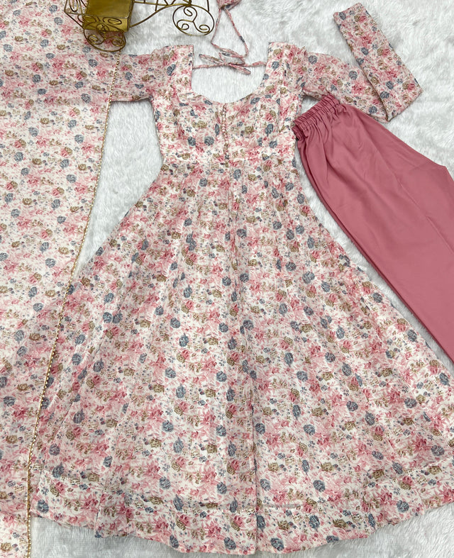 Trendy Orange Flower Print Pink Color Anarkali Suit
