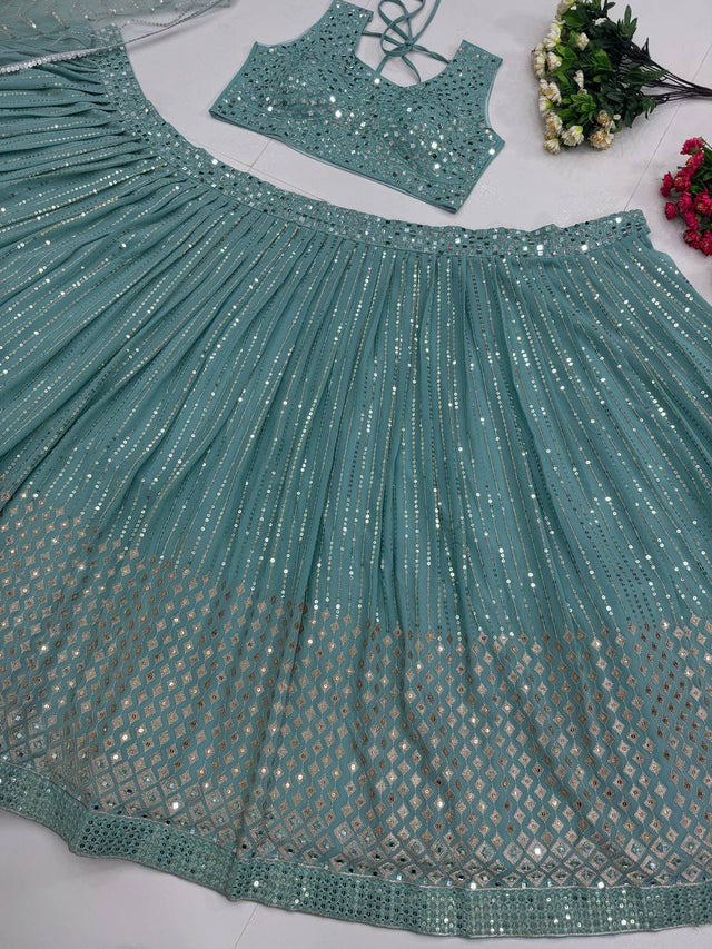 Wedding & Party Wear Real Mirror Hand Work Sky Blue Color Lehenga Choli
