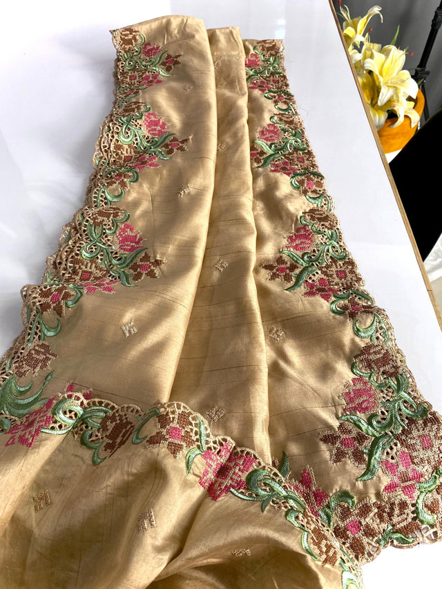 Description - Tussar silk sarees with all over embroidery design and cut-work design.
