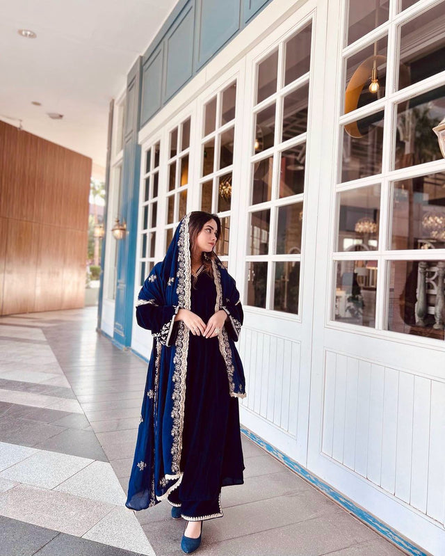 Wonderful Bell Sleeve Blue Color Velvet Salwar Suit
