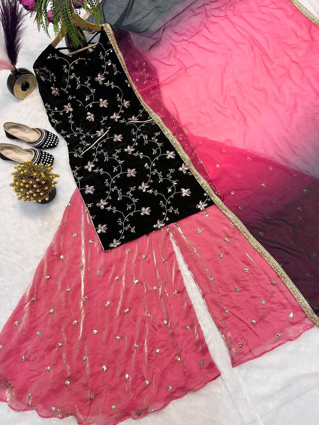 Wonderful Black Crushi Silk Sequence Work Sharara Suit