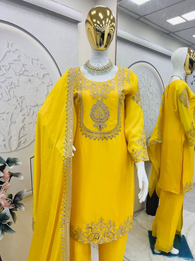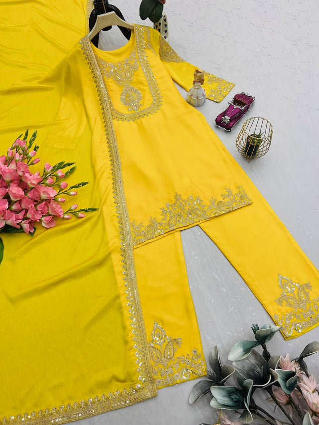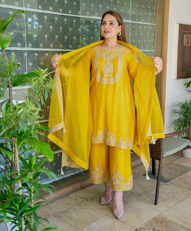 Wonderful Yellow Chinon Silk Work Palazzo Suit