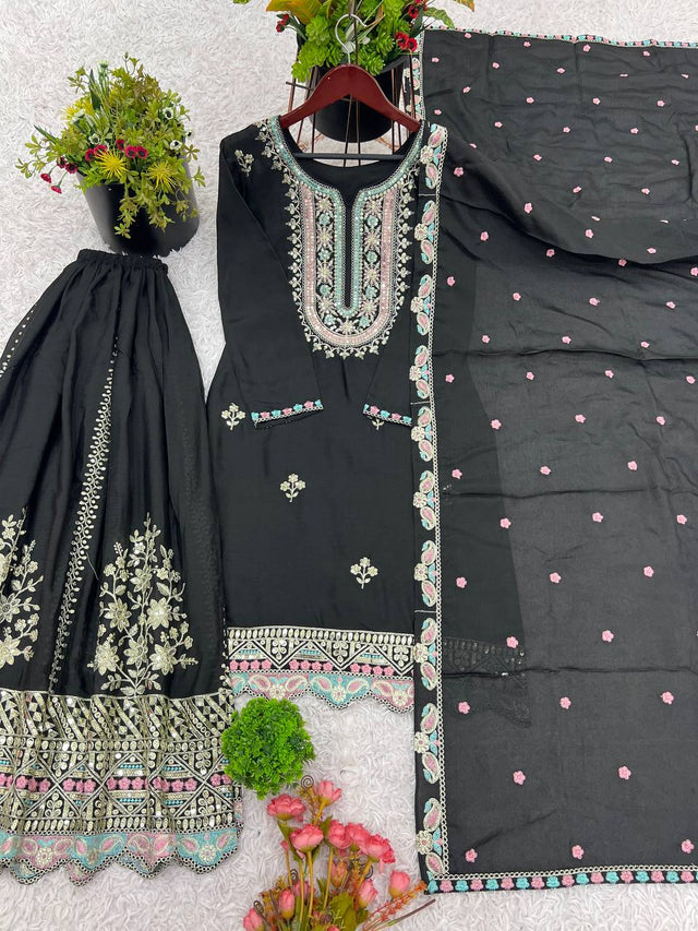 *Sharara Fabrics* : *Heavy Chinon Silk With *Malty Thread Embroidery Sequence Work With Flair*