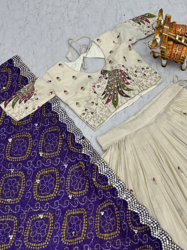 Wonderful Embroidery Work White Color Lehenga With Purple Dupatta