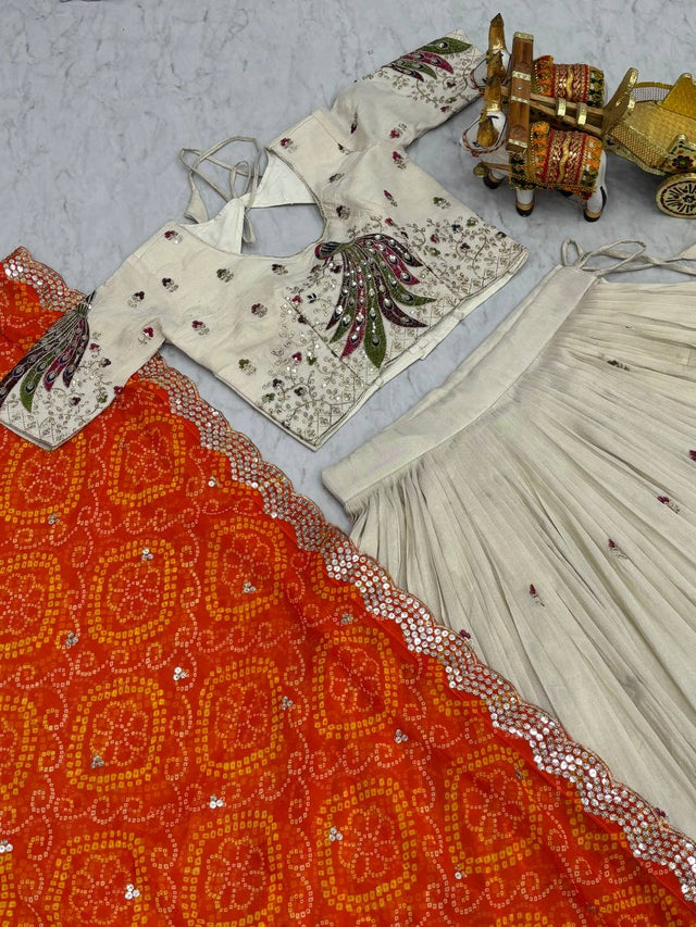 Wonderful Embroidery Work White Color Lehenga With Orange Dupatta