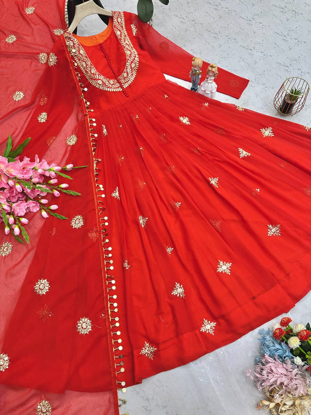 Wonderful Georgette Sequins Work Orange Color Gown